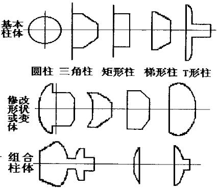 的正式产品目前采用的漩涡发生体是多种多样的,但大量采用的圆管内漩涡发生体都是柱体,其断面形状基本有5种:1.圆柱;2.三角杞;3.矩形柱;4.梯形柱;5.T形柱.此外还可以采用以上5种柱型的修改形状或变形,以及几种基本形状组合在一起的组合柱型,如图5所示。
