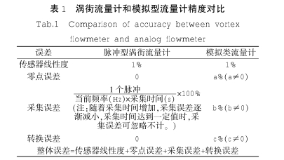 具有了全量程范围内流量信号精确的特点,是其它模拟类流量计不可比拟的优点。传感器线性均为18的脉冲型涡街和模拟类流量计精度对比如表1所示。