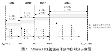 在低频段,涡街信号经过相同转折频率的低通滤波器,输出幅值为常数;在高频段,低通滤波器转折频率后移,使低通滤波器基本放开。图1为50mm口径管道液体的频率段划分示意图。此四频段信号处理方法构成的“测量通道”是整个涡街信号处理体系的主体通道。
