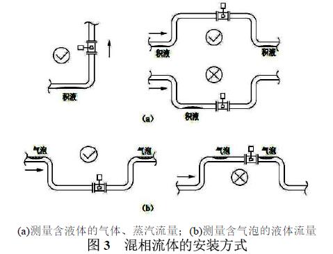 在管道上可以水平、垂直或倾斜安装,但测量混相流体时,测量精度得不到保障,需保证测量流体充满管道,避免产生混相流,根据混相流体的特点,选择合适的安装方式,具体的安装方式如图3 所示。