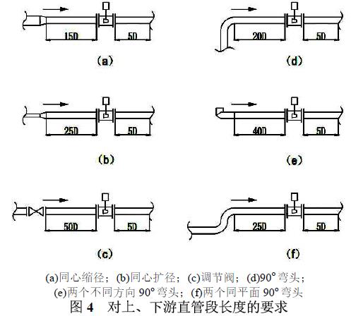 必须在稳定的流束场内,有一定的直管段要求,直管的长度会影响精度,必须保证上、下游直管段有一定的长度,通常是上游直管段>10D,下游直管段>5D,还要结合现场安装情况进行调整,如果上游有弯头或者阀门,直管段相应的需要加长,具体的安装要求如图4 所示。